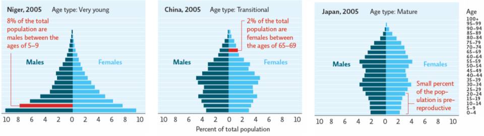 | Niger's young population has high population momentum (capacity for population growth). | China's transitional population exhibits moderate, stable growth. | Japan's mature age structure with low proportion of young individuals shows low population momentum. |