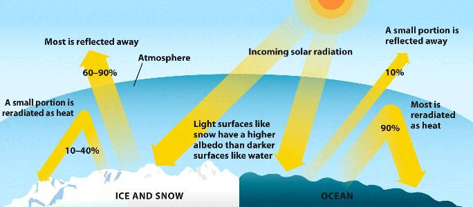 This becomes a positive feedback loop: the lower-albedo surfaces absorb more heat, and ice melt accelerates.