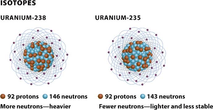Uranium has an atomic number of 92; two isotopes are U-238 with 146 neutrons and U-235 with 143 neutrons.