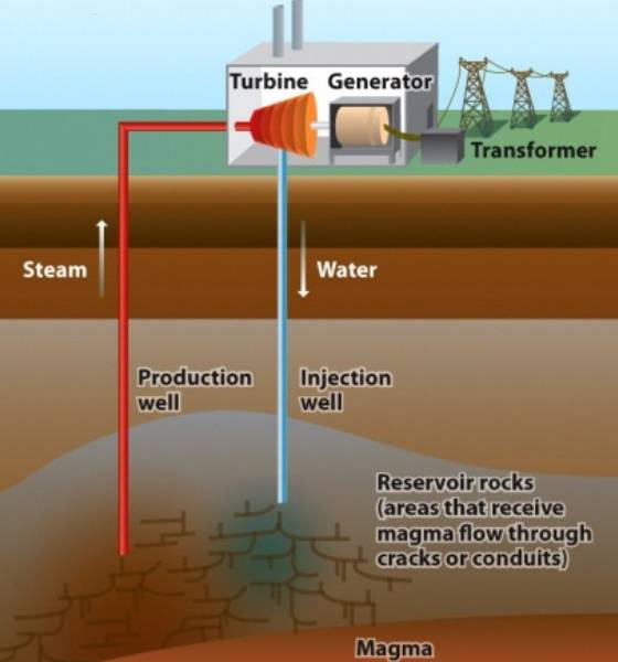 Dry steam geothermal power plants extend geothermal availability by pumping water down wells; the hot steam rises to spin turbines and generate electricity.