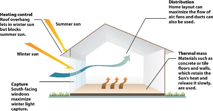 A passive solar house uses no moving parts but relies on exploitation of greenhouse effects.