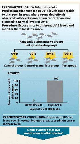 In our hypothesis of exposure to UV-B, a test group may be exposed to high levels of UV-B, while a control group suffers no such exposure.