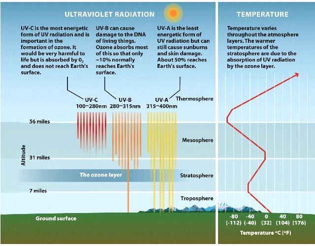 - UV-A is the least damaging; 50% reaches the earth's surface.