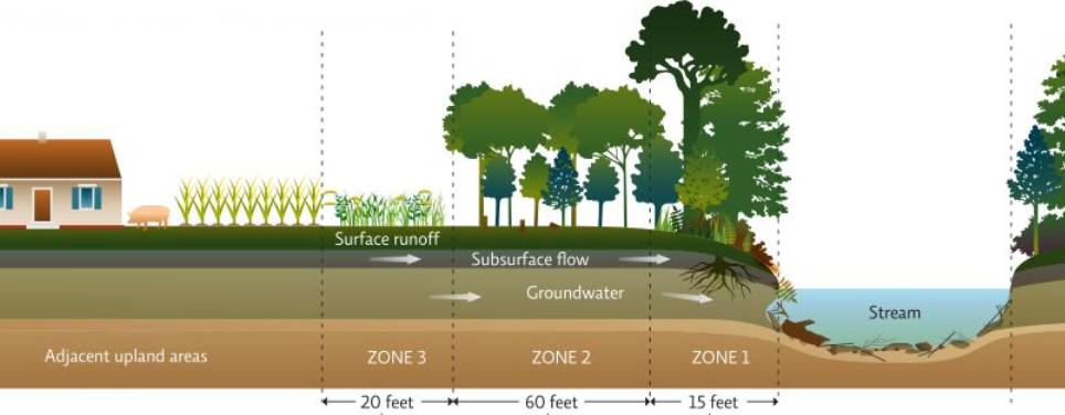 | Human use such as residential and agriculture is confined to upland regions. Excess nutrients flow down toward stream. | Zone 3: a narrow strip of light agriculture with minimal chemical use absorbs flow. | Zone 2: a managed forest with controlled harvesting further absorbs runoff. | Zone 1: an undisturbed forest, preferably planted with native riparian trees, provide habitat for the stream. |