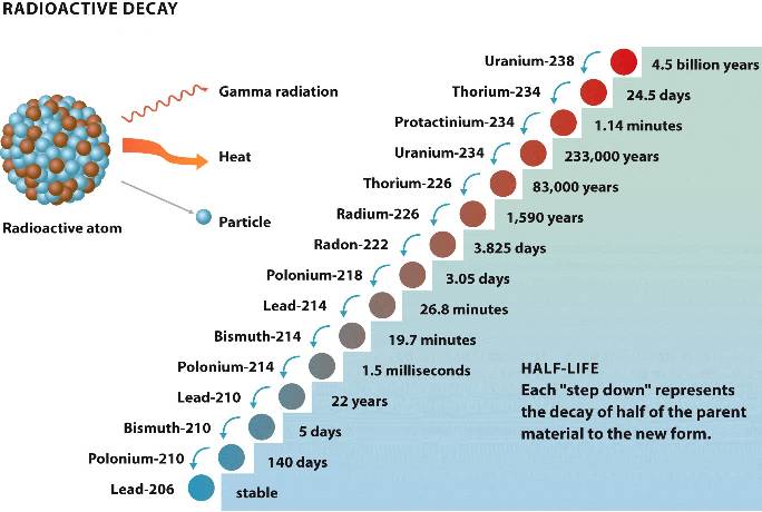The radioactive decay of an isotope such as Uranium-238 may undergo many radioactive daughter isotopes before reaching a stable product such as Lead-206.