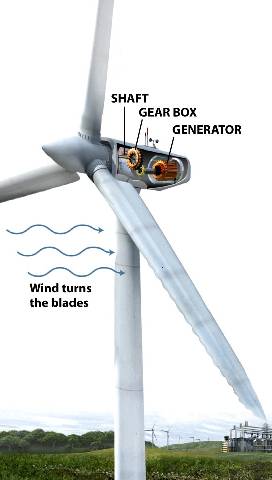 Spinning blades turn a shaft; a gear box transfers energy to a generator, producing electricity.