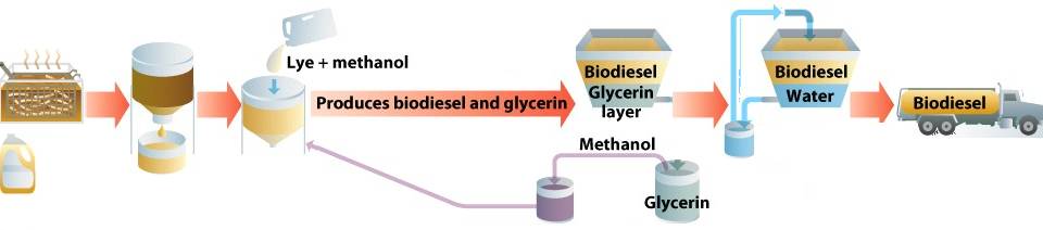 | Feedstock for biodiesel can be vegetable oil, animal fat, or recycled grease. After filtering, a mixture of lye and methanol is added. | Chemical reactions yield biodiesel and glycerin as a commercial byproduct; leftover methanol is reused. | Washing with water removes impurities. The biodiesel can power diesel engines. |